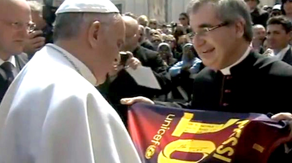 El papa Francisco ha recibido durante la audiencia pública de los miércoles una camiseta del jugador argentino del Barcelona Leo Messi, con la firma del futbolista, que le fue entregada por varios sacerdotes.