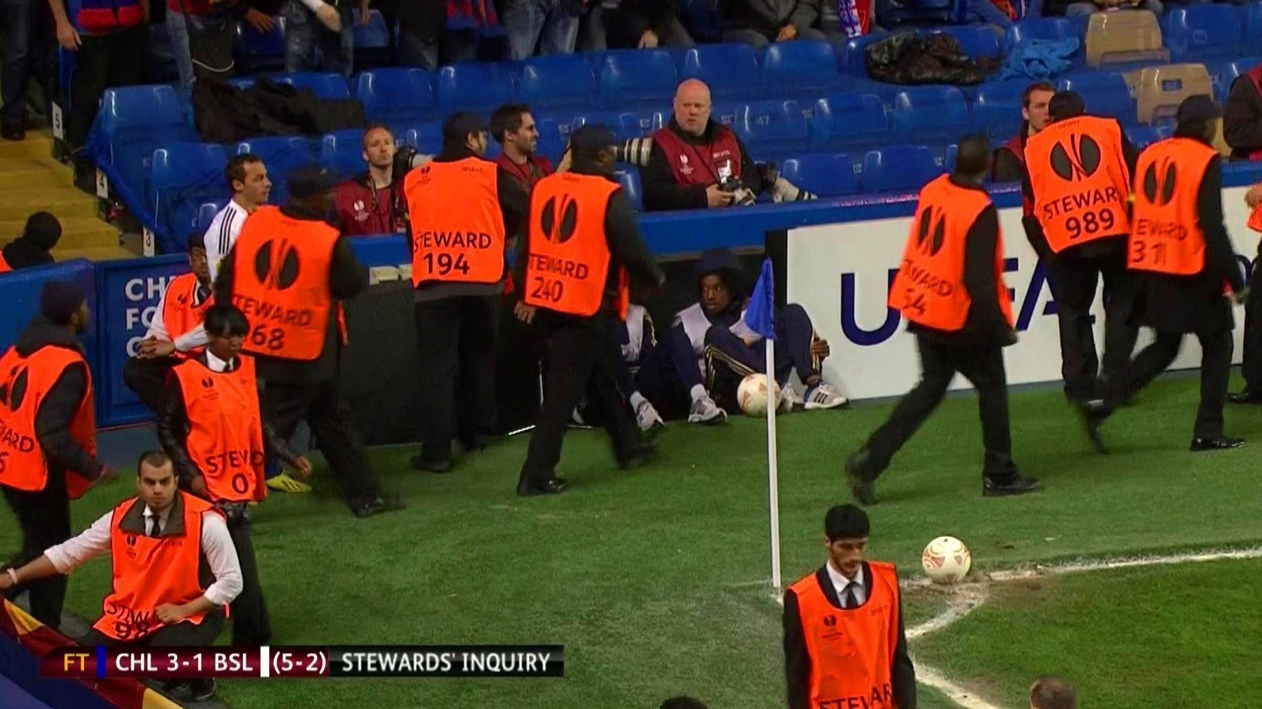 Los stewards de Stamforg Bridge molestaron al chileno Marcelo Díaz cuando trataba de sacar un córner contra la portería de Petr Cech durante el partido Chelsea-Basilea, de vuelta de semifinales de la Europa League.