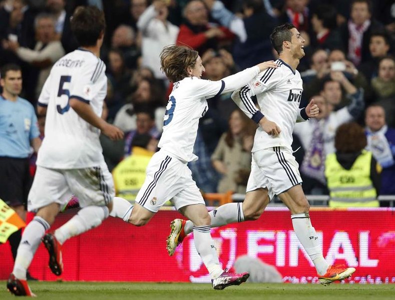 Cristiano Ronaldo celebra junto a Coentrao y Modric su gol de cabeza a los 13 minutos, que sirvió al Madrid para adelantarse en el marcador.