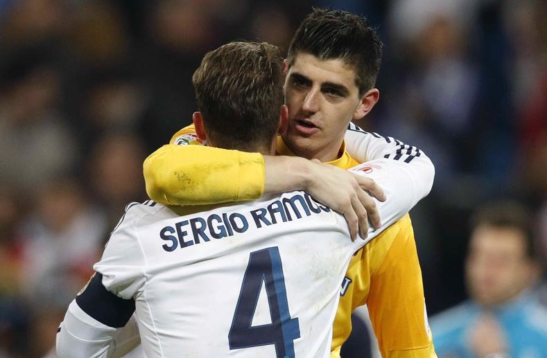 Thibaut Courtois, uno de los grandes nombres de la noche con sus paradas, abraza a Sergio Ramos para consolarle.