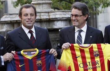 Rosell entregó al presidente catalán, Artur Mas, las dos equipaciones de la próxima temporada: la primera, con los clásicos colores azulgranas; y la camiseta reserva, inspirada en la bandera catalana, con cuatro barras rojas sobre un fondo amarillo.