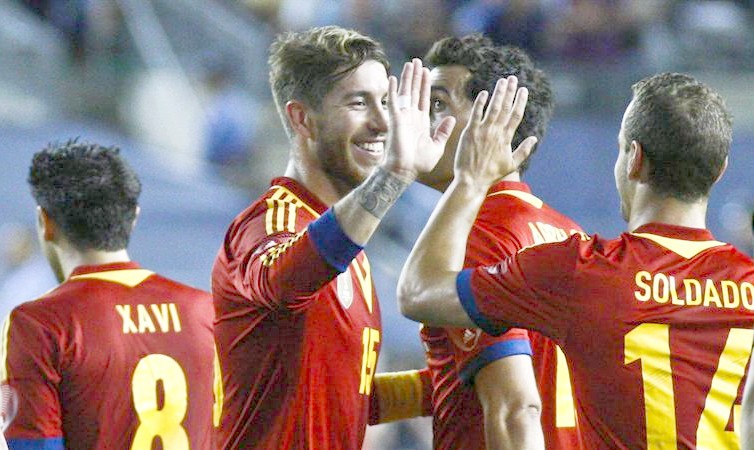 España: Valdés; Arbeloa, Sergio Ramos, Piqué, Jordi Alba; Busquets, Xavi; Iniesta, Cesc, Pedro; y Soldado