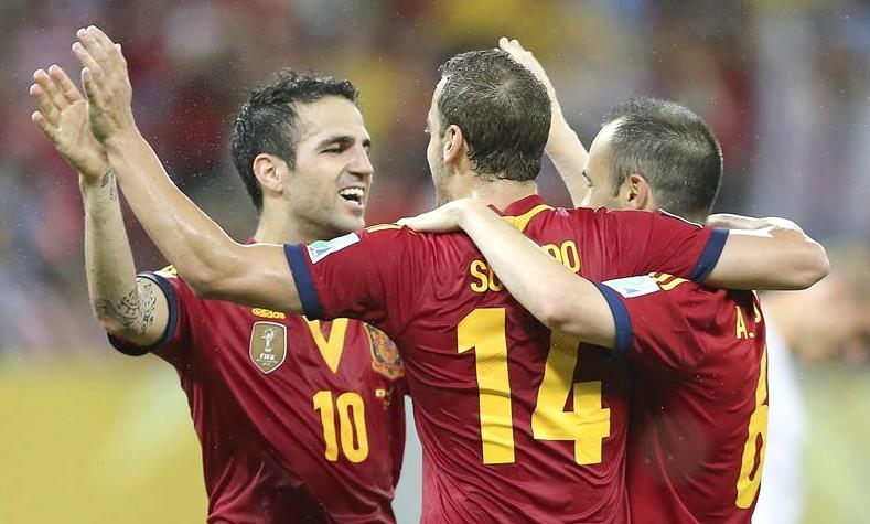 España merecía el gol y no tardó en encontrarlo. A los 20 minutos, Pedro aprovechó un rechace para cazar un balón muerto en la frontal del área grande y conectar un disparo. La pelota iba fuera, pero Lugano, que tuvo una noche negra, la desvió hacia su portería sin que nada pudiera hacer Muslera por evitarlo. Pintaban oros para la selección española, que a la media hora amplió la ventaja con el tanto de Soldado. El delantero del Valencia se benefició de un genial pase de Cesc, rompiendo la defensa celeste, para fusilar a Muslera dentro del área.
