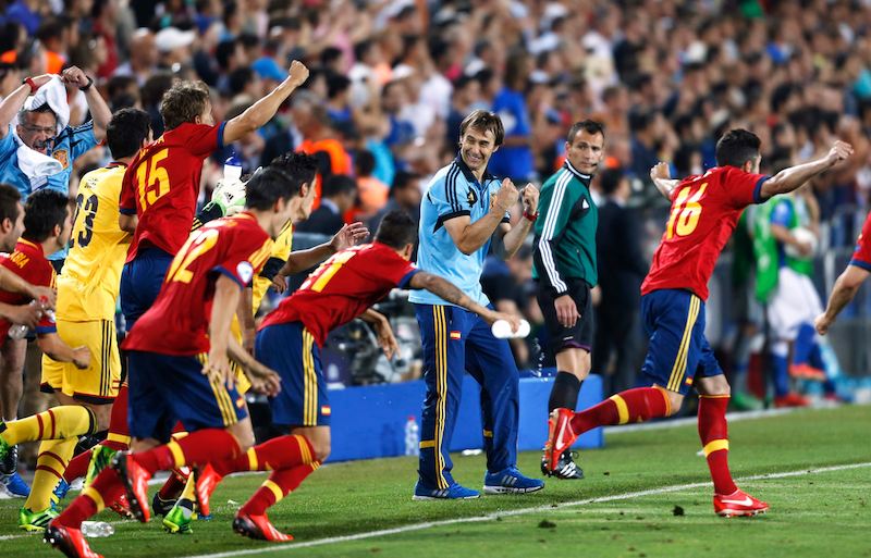 Julen Lopetegui celebra con sus jugadores la victoria contra Italia tras el pitido final. El técnico guipuzcoano ha recogido con éxito el testigo que le dejó Luis Milla, que llevó a España a la gloria en el Europeo de Dinamarca, aunque fue destituido un año después tras el decepcionante papel de la selección olímpica en los Juegos de Londres 2012.