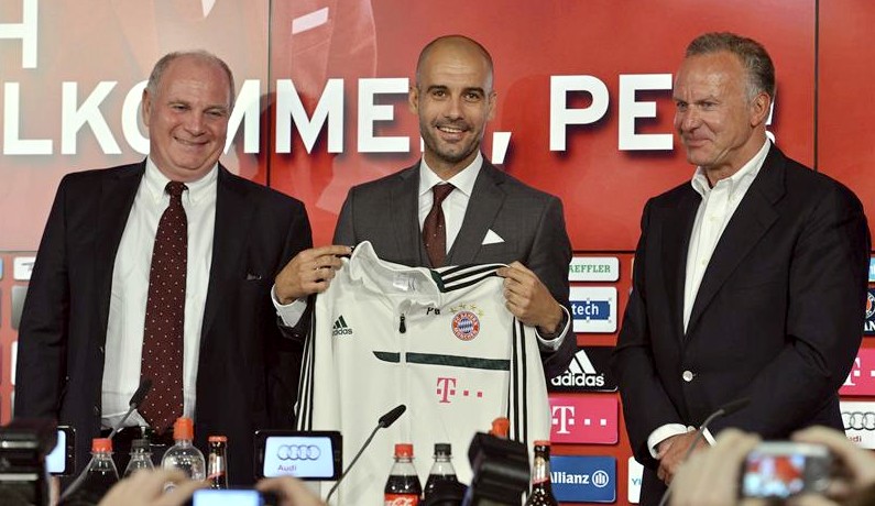 Pep Guardiola posa con la camiseta de su nuevo equipo, en un acto en el que estuvo arropado por el presidente del Bayern de Múnich, Uli Hoeness (i), y el presidente del Consejo de Vigilancia del club, Karl-Heinz Rummenigge.