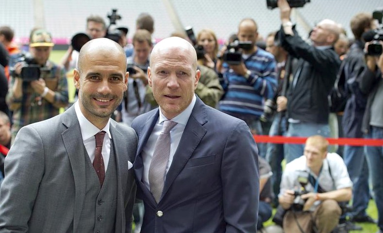 Ante una nube de fotógrafos, Guardiola posa sobre el césped junto al exfutbolista alemán Matthias Sammer, actual director deportivo del Bayern.