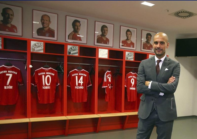 Pep Guardiola no quiso perder detalle de las instalaciones de su nuevo club y también visitó el vestuario del Allianz Arena.