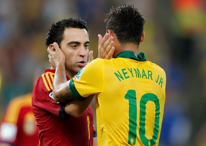 La estrella de la selección brasileña tuvo un gran detalle tras el partido al consolar, uno por uno, a los jugadores españoles. En la imagen lo vemos con Xavi, que a partir de la próxima temporada será su compañero en el Barcelona.