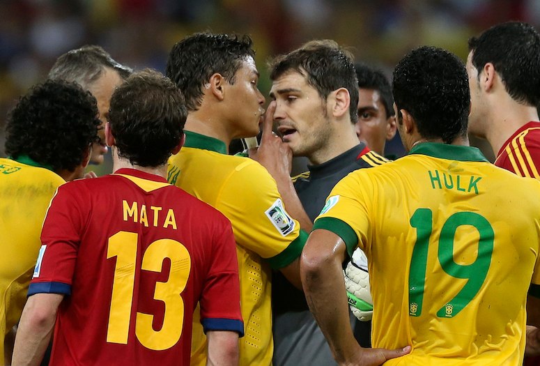 La tensión se mascó en Maracaná, como en esta secuencia en la que se encaran los dos capitanes, Thiago Silva e Iker Casillas, durante un lance de la primera parte.
