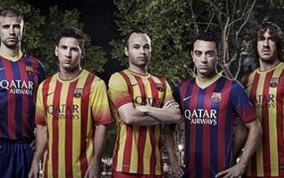 El Barcelona eligió una fotografía con seis futbolistas para promocionar las nuevas camisetas para la próxima temporada. En ella aparecían de izquierda a derecha Thiago, Piqué, Messi, Iniesta, Xavi y Puyol. Hasta ahora, todo parece normal. Sin embargo, el club azulgrana ha incluido una modificación en esta imagen que ha llamado sobradamente la atención.
