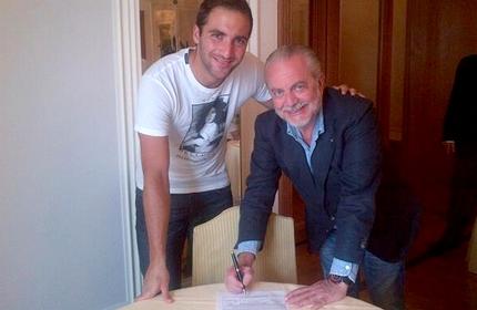 El club italiano anunció este sábado de modo oficial el fichaje del futbolista a través de un escueto comunicado y mediante un mensaje en la red social Twitter de su presidente, Aurelio de Laurentiis, muy activo este verano en el mercado de fichajes. "Esta mañana hemos firmado el contrato con Higuaín. En cuanto tenga un momento os enseñaré una bonita foto que nos hemos hecho", dice De Laurentiis.