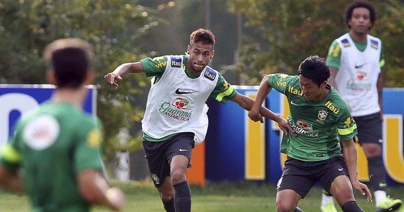Se encienden las alarmas en la selección brasileña y en el Barcelona. Neymar se ha retirado del entrenamiento tras un encontronazo con su compañero Hernanes. El delantero azulgrana se golpeó la cadera y abandonó la sesión por precaución, después de ser examinado por el masajista y un médico de la canarinha.
