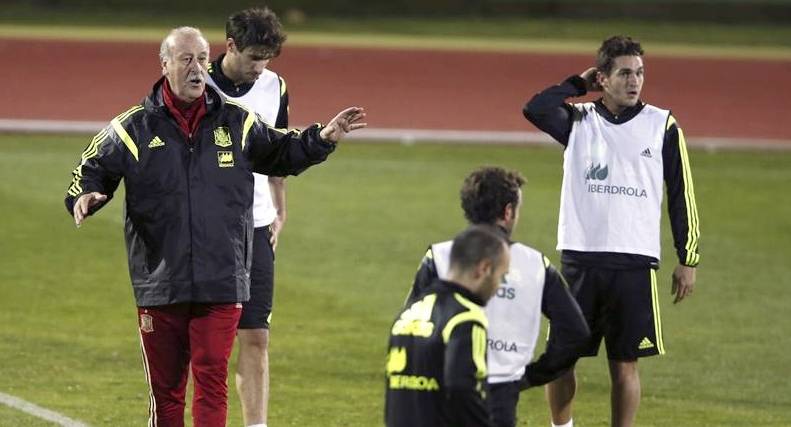 Vicente del Bosque ha ensayado con un 4-3-3, sacando en el teórico equipo titular un once formado por: Valdés; Arbeloa, Albiol, Sergio Ramos, Monreal; Xabi, Busquets, Iniesta; Pedro, Llorente y Villa.