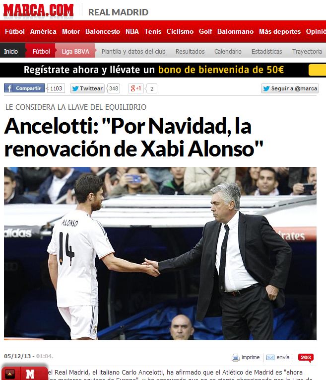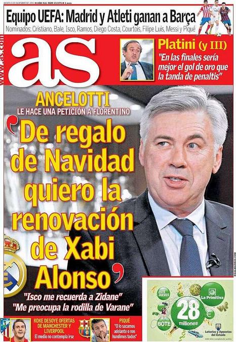 Como As, su principal competidor, el diario Marca también destacó que Ancelotti quiere "por Navidad, la renovación de Xabi Alonso".