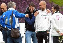 Raúl bromea con Pep Guardiola durante el entrenamiento del Bayern.