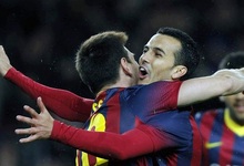 Pedro celebra con Messi su gol al Málaga. | EFE