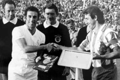 Desde siempre han saltado chispas entre Real Madrid y Atlético, dos enemigos íntimos cuya rivalidad trasciende el terreno de juego. En esta imagen de 1975, Amancio Amario -el gallego se las tenía muchas veces tiesas con José Luis Capón- saluda a Adelardo Rodríguez, capitán rojiblanco y el jugador que más veces ha vestido la camiseta del club colchonero.