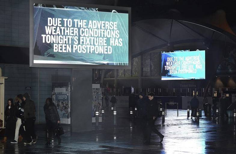 El encuentro del City iba a celebrarse a las 19.45 GMT, pero ha sido suspendido por las adversas condiciones meteorológicas, según informó en su cuenta de Twitter Vincent Kompany, capitán de los "citizens", y posteriormente corroboró la policía.