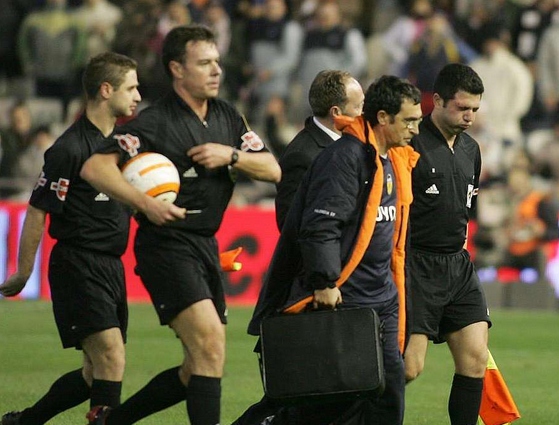 Sin duda una de las imágenes más impactantes del fútbol español. Durante un Betis-Sevilla de Copa, una botella lanzada desde la grada derribó al entonces técnico sevillista, Juande Ramos, que celebraba un gol de los suyos. Undiano Mallenco suspendió el encuentro, reanudado en terreno neutral, y el Villamarín se cerró tres partidos.