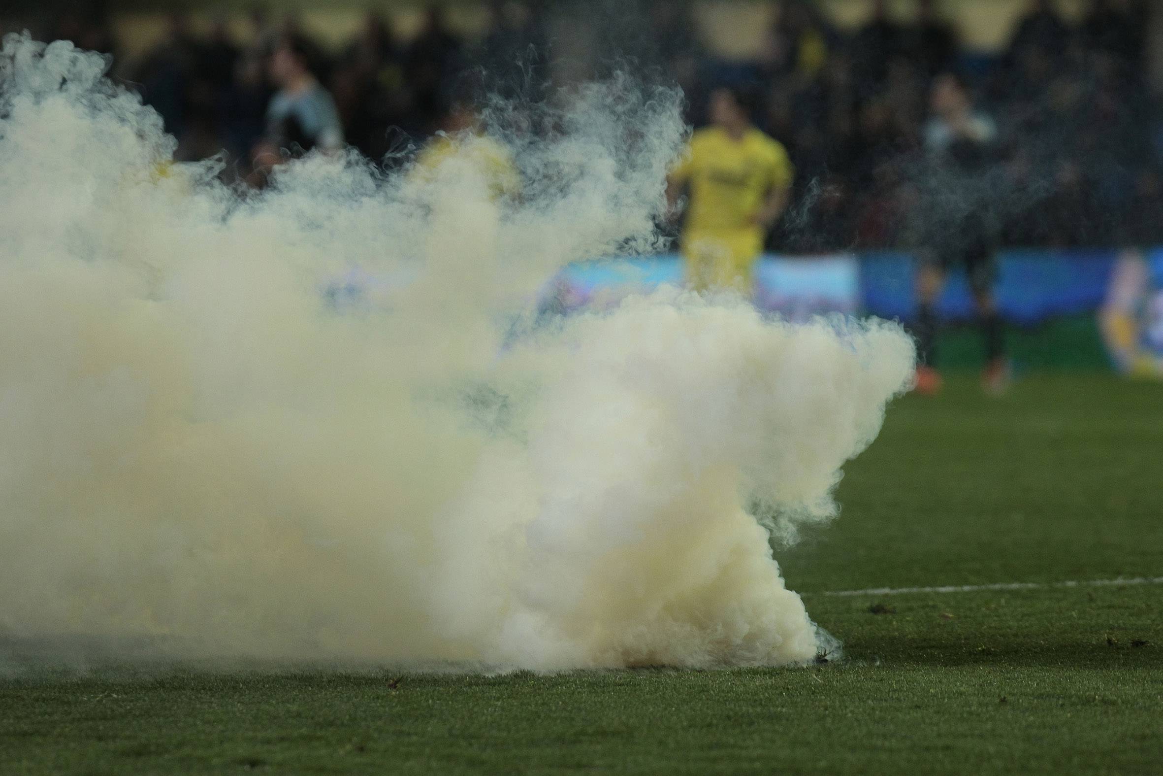 El lanzamiento de una bomba lacrimógena sobre el césped de El Madrigal obligó a interrumpir el duelo entre el conjunto castellonense y el Celta de Vigo y desalojar el estadio.