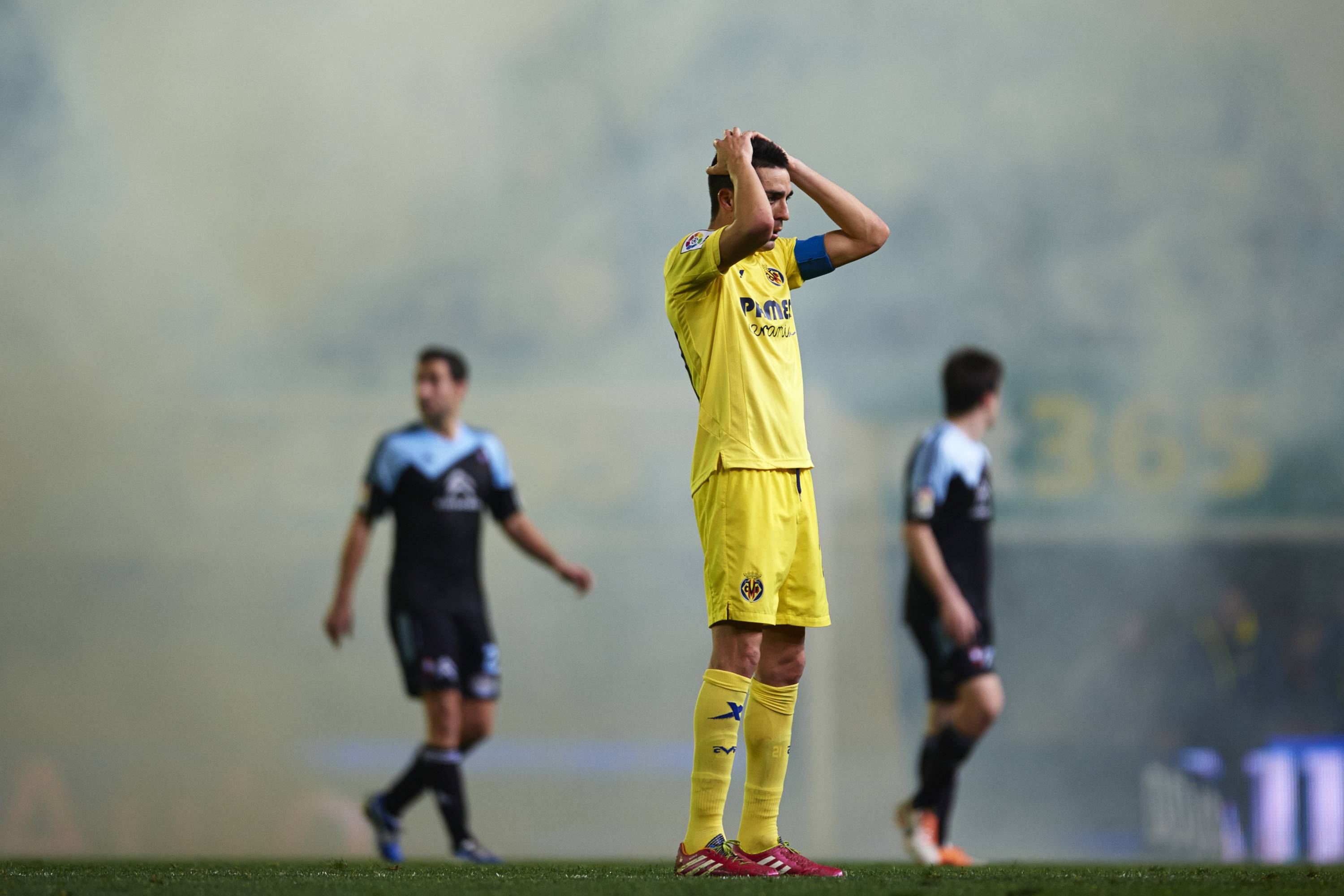 Momentos de confusión y pánico se vivieron sobre el terreno de juego. En la imagen, Bruno, capitán del Villarreal, se echa las manos a la cabeza.