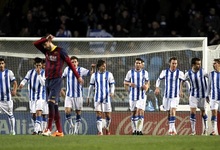 Los jugadores de la Real celebran un gol ante el lamento de Piqué. | EFE