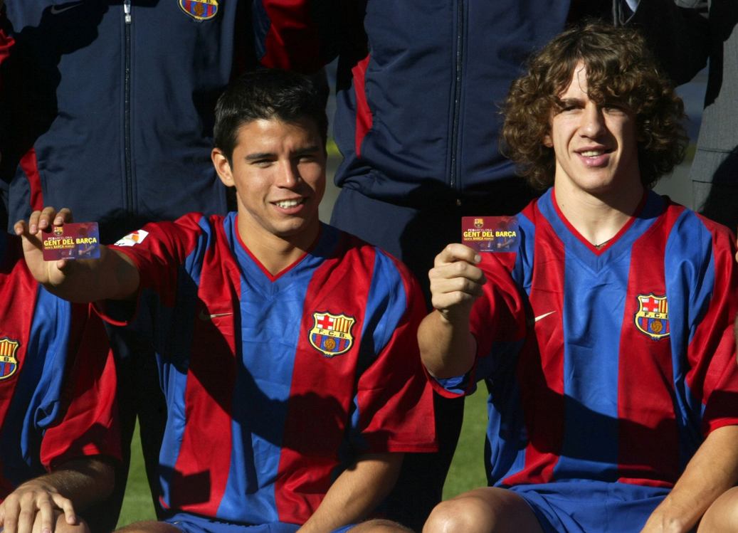 Foto oficial del FC Barcelona de la temporada 2002/03. Un joven Puyol -entonces tenía 24 años- aparece en la imagen junto a Javier Saviola mostrando los carnés de seguidor culé.