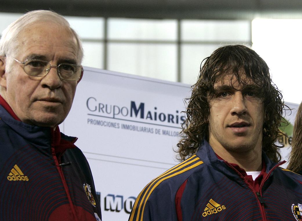 Carles Puyol tuvo numerosos entrenadores a la largo de su carera y uno de ellos fue Luis Aragonés, quien lo dirigió en la selección española que en junio de 2008 conquistó la Eurocopa de Austria y Suiza. La fotografía corresponde a un acto promocional en Palma de Mallorca en marzo de 2007, donde la selección disputó un partido de clasificación para aquella Eurocopa ante Islandia (1-0).
