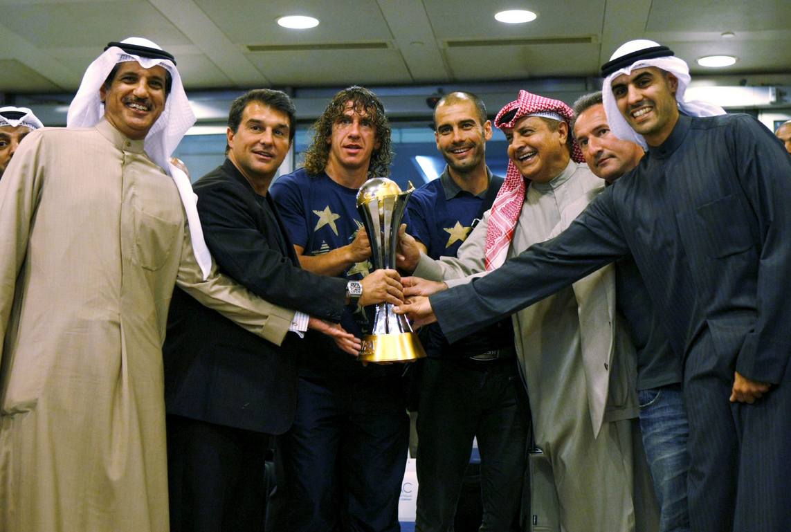 Puyol, eterno capitán del Barça, posa junto a Joan Laporta, Pep Guardiola y Aitor Txiki Begiristain con el trofeo que acredita al club como campeón del Mundial de Clubes de 2009, disputado aquella edición en Abu Dhabi, tras derrotar al Estudiantes de La Plata en la final.