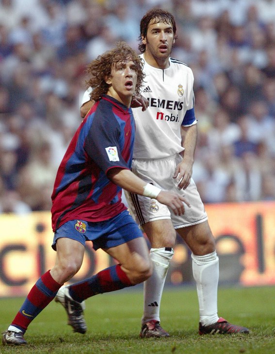 Unos de los partidos más especiales para Puyol han sido los clásicos contra el Real Madrid -en la imagen, luchando por una pelota con Raúl-, como éste que jugó en el Santiago Bernabéu en abril de 2004 (victoria del Barça por 1-2, con goles de Kluivet y Xavi, que remontaron el tanto inicial de Solari). Aquel año la Liga no fue ni para culés ni merengues, sino para el Valencia de Rafa Benítez.