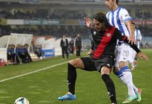 Larrivey protege el balón ante José Ángel durante el partido disputado en Anoeta. | EFE