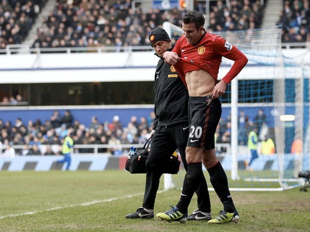 Robin van Persie es una de las bestias negras del Manchester United. El delantero holandés dio el susto durante un partido tras golpearse la cadera y dejó perplejo al público cuando se levantó la camiseta para que le atendieran.