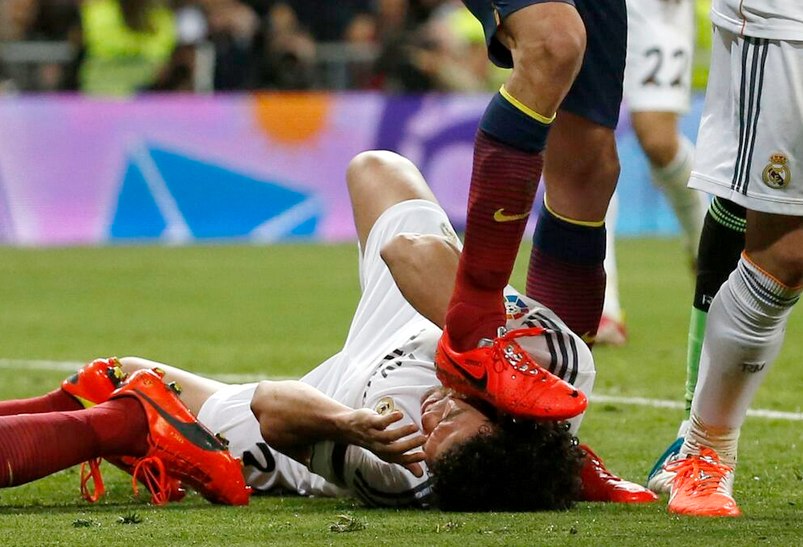 (23/03/2014). Último clásico liguero en el Bernabéu (3-4). En el minuto 42, segundos después de que Messi marcara el empate a dos provisional, se produjo una tangana en el área de Diego López y Busquets aprovechó que Pepe estaba en el suelo para pisarle la cabeza.
