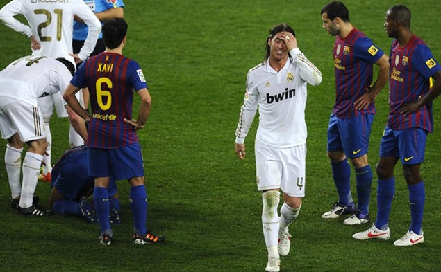 (25/01/2012) Camp Nou. Vuelta de cuartos de final de la Copa del Rey (2-2). Sergio Ramos fue expulsado en el minuto 88 al ver la segunda amarilla por un supuesto codazo a Busquets. Horas después, el sevillano acusó de teatro al culé. "Me alegra que el club recurra mi segunda tarjeta amarilla porque a pesar de que algunos no paren de revolcarse, ni le toco", dijo el andaluz. El árbitro era Fernando Teixeira Vitienes.