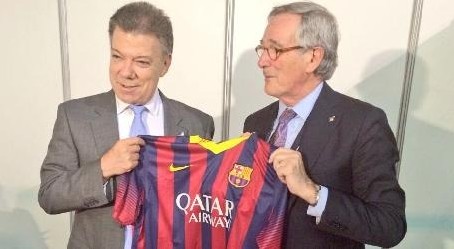 Tanto al presidente de Colombia, Juan Manuel Santos, como al hijo del alcalde de Río de Janeiro Trias les ha regalado una camiseta del primer equipo del Barcelona, como revela la cuenta de Twitter oficial de la delegación de la Generalidad de Cataluña en los Estados Unidos, que publica la fotografía.