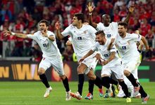 Los jugadores del Sevilla, tras superar al Benfica en los penaltis. | EFE