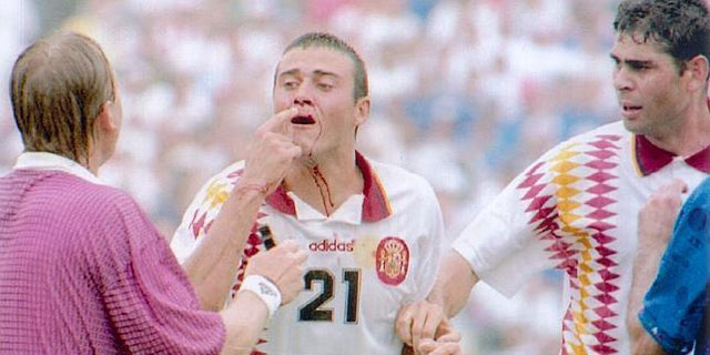 Y aún hubo tiempo para más. En el tercer minuto de la prolongación, un balón colgado al área de ataque española terminó con Luis Enrique en el suelo, sangrando abundamente. Tassotti le había propinado un terrible codazo, en lo que era sin duda un penalti que no vio el colegiado. El futbolista español se levantó entre sangre y lágrimas a protestar. Nunca una imagen representó tan bien el sentir de todo un país futbolístico. Una vez más, tocaba retomar el camino a casa de manera inaceptable.