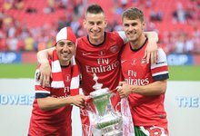 Cazorla (i), Koscielny (c) y Ramsey, con el trofeo de la FA Cup. | Cordon Press