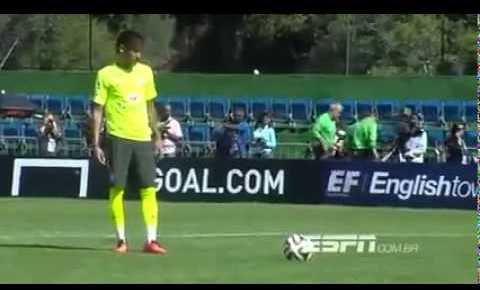 El delantero brasileño Neymar sorprendió a los asistentes al entrenamiento de la canarinha con este singular disparo desde el punto de penalti.