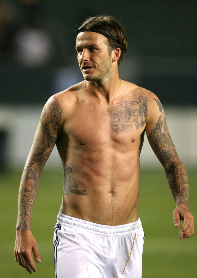 David Beckham tiene pocos huecos sin pintar en su cuerpo. El excapitán de la selección inglesa, entre otros muchos, lleva los nombres de sus hijos y una frase en letras chinas que dice "La vida y la muerte están determinadas por el destino, rango y riqueza decretado por el cielo".