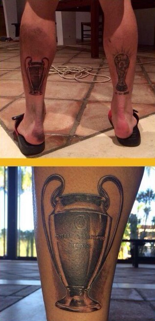 El jugador del Real Madrid Sergio Ramos lleva tatuada la Copa del Mundo en su pierna derecha y la Décima en la izquierda.