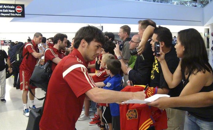 Los jugadores de la selección española de fútbol se han dado un baño de masas a su llegada a Estados Unidos, país en el que permanecerán durante unos días en su preparación para el Mundial de Brasil 2014. John Vázquez, colaborador del Grupo Libertad Digital, ha sido testigo de excepción de la llegada de los campeones del mundo al Aeropuerto Internacional de Baltimore-Washington.