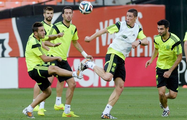 Del Bosque alineó en un equipo con peto blanco a Iker Casillas, Azpilicueta, Javi Martínez, Sergio Ramos, Pedro, Xavi, Cazorla, Silva, Cesc y Fernando Torres, y otro de amarillo con Reina, Juanfran, Piqué, Raúl Albiol, Jordi Alba, Busquets, Koke, Iniesta, Mata, Villa y Diego Costa.