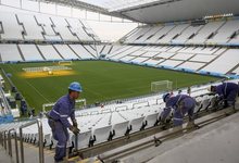 Obreros dan los últimos retoques en el Arena Corinthians a pocas horas del partido inaugural. | EFE