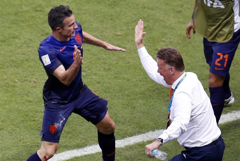 Van Persie choca su mano con Van Gaal después de conseguir el gol del empate.