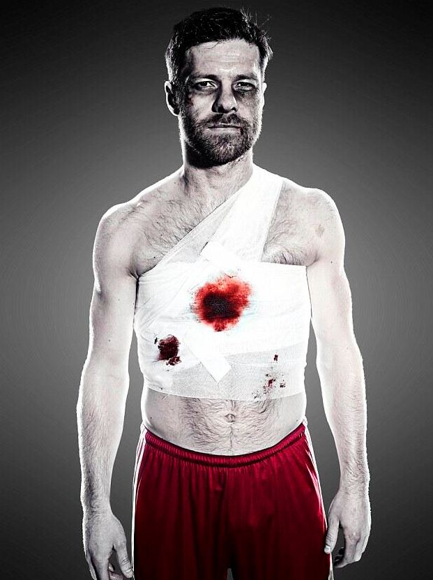 El internacional español Xabi Alonso posa con vendajes y magulladuras.