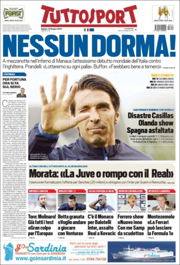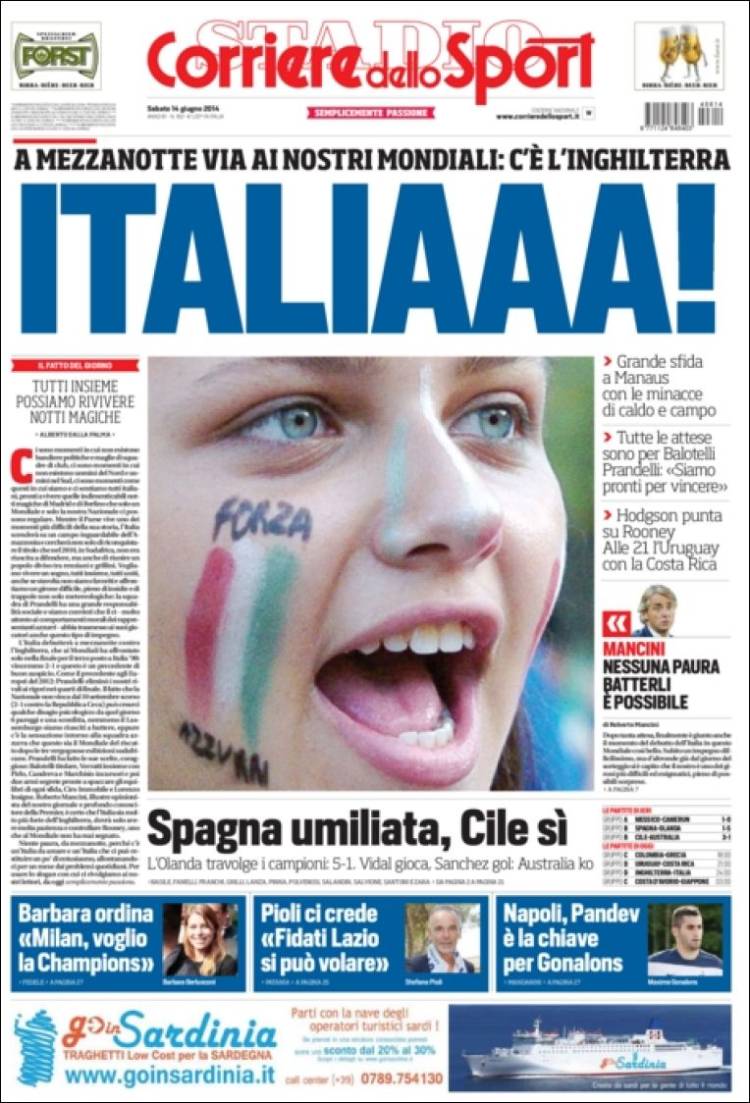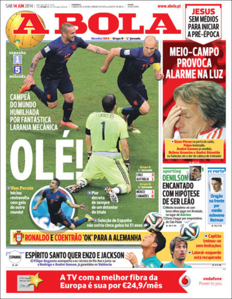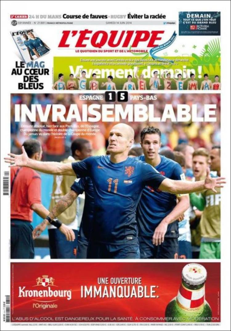 La mayoría de las portadas de la prensa extranjera destaca la derrota de la selección española ante Holanda (1-5) en el debut del conjunto de Del Bosque en el Mundial de Brasil.
