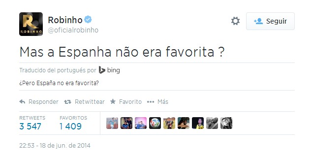 "¿Pero España no era la favorita?", escribió Robinho en su cuenta de Twitter tras el partido, a pesar de que en la selección española hay jugadores, como Iker Casillas o Sergio Ramos, que fueron sus compañeros en el club blanco y que le siguen en esta red.