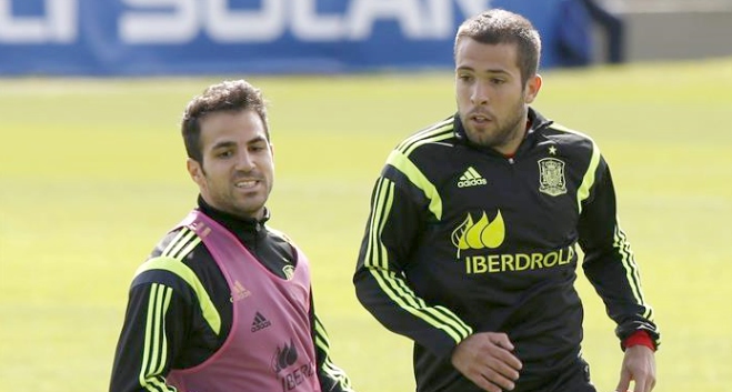 Jordi Alba y Cesc, durante el entrenamiento de la selección. | EFE