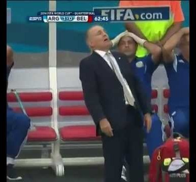 El seleccionador de Argentina, Alejandro Sabella, perdió el equilibrio al lamentarse del disparo que Higuaín estrelló en el larguero durante el partido frente a Bélgica. La tensión era máxima.